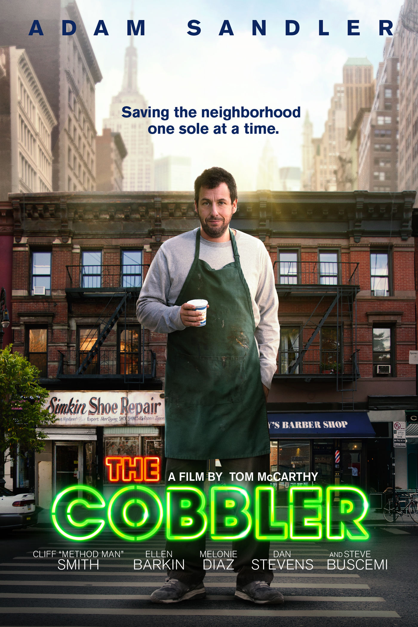 Max Simpkin (Adam Sandler) is the fourth generation owner of his family’s cobbler shop in the Lower East Side of Manhattan: Simpkin Shoe Repair. Neighboring him is a barbershop owned by a friendly man named Jimmy (Steve Buscemi), and to the other side an attractive young couple. Max appears bored with his life, and when the young and passionate Carmen Herrera (Melonie Diaz) comes to his shop to garner his support against big-time developers who are trying to rebuild the Lower East Side into large building complexes, he shows little interest in protecting his shop. Max lives with his mother Sarah (Lynn Cohen), who appears to be suffering from Alzheimer’s. His father is not in the picture, although Sarah wishes have dinner with him one last time. One day, an intimidating and rude man named Leon Ludlow (Method Man) bursts into Simpkin Shoe Repair and demands that Max repair his shoes and have them ready by the end of the night. While working on Leon’s shoes, Max’s machine breaks and he finishes the job using an older machine in the basement of the shop. As he waits for Leon to pick up the shoes, Max notices that he and his customer share the same shoe size (try saying that five times fast). Out of curiosity, Max tries on the shoes and finds himself transformed into an exact doppelganger of their owner. Max uses his machine on countless other pairs of shoes, becoming each’s owner, and begins to do all of the things he had never been able to do as a lowly cobbler.